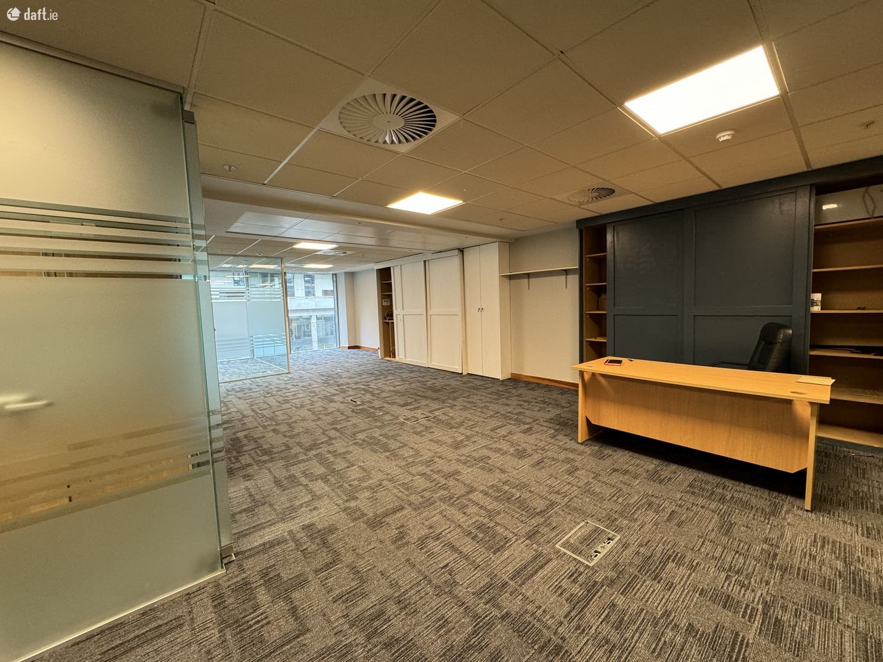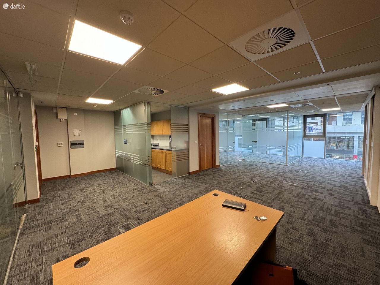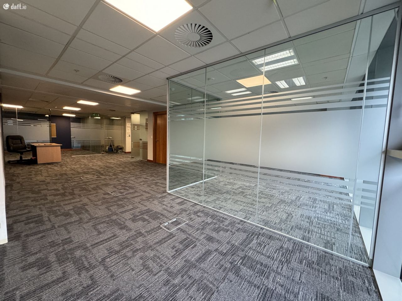The office itself is open-plan with glazed partitioning. Convienent floorboxes provide data & power. Air-conditioned with fully fitted kitchen and accessible restroom. Secure with intruder alarm and controlled entry with maglock on door. Fire alarm.